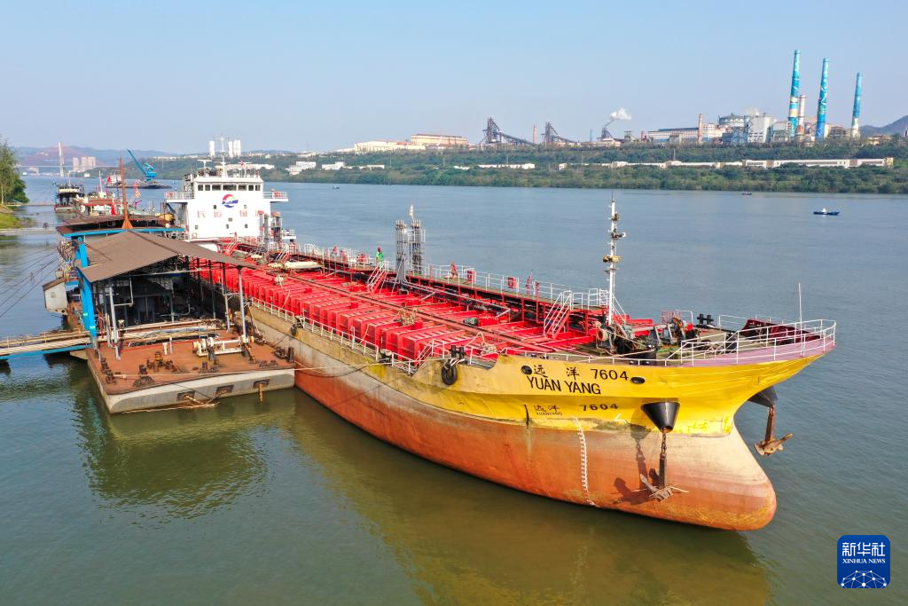 10月17日,在中国石化集团重庆川维化工有限公司物流码头,出口的产品正在装船(无人机照片)。新华社记者 唐奕 摄
