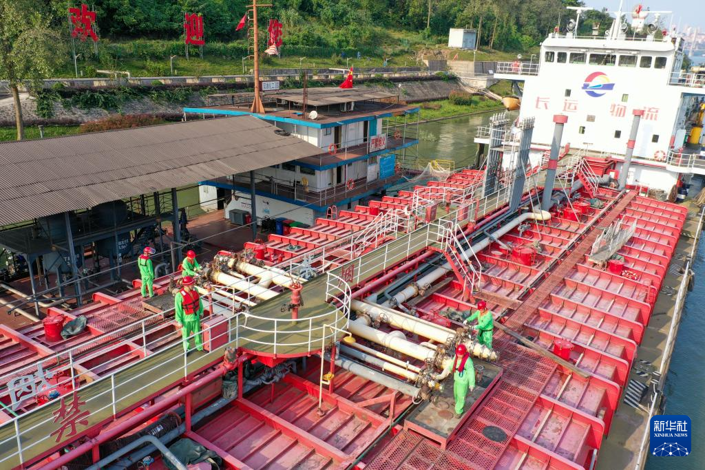 10月17日,在中国石化集团重庆川维化工有限公司物流码头,工作人员在检查出口产品装船情况(无人机照片)。新华社记者 唐奕 摄
