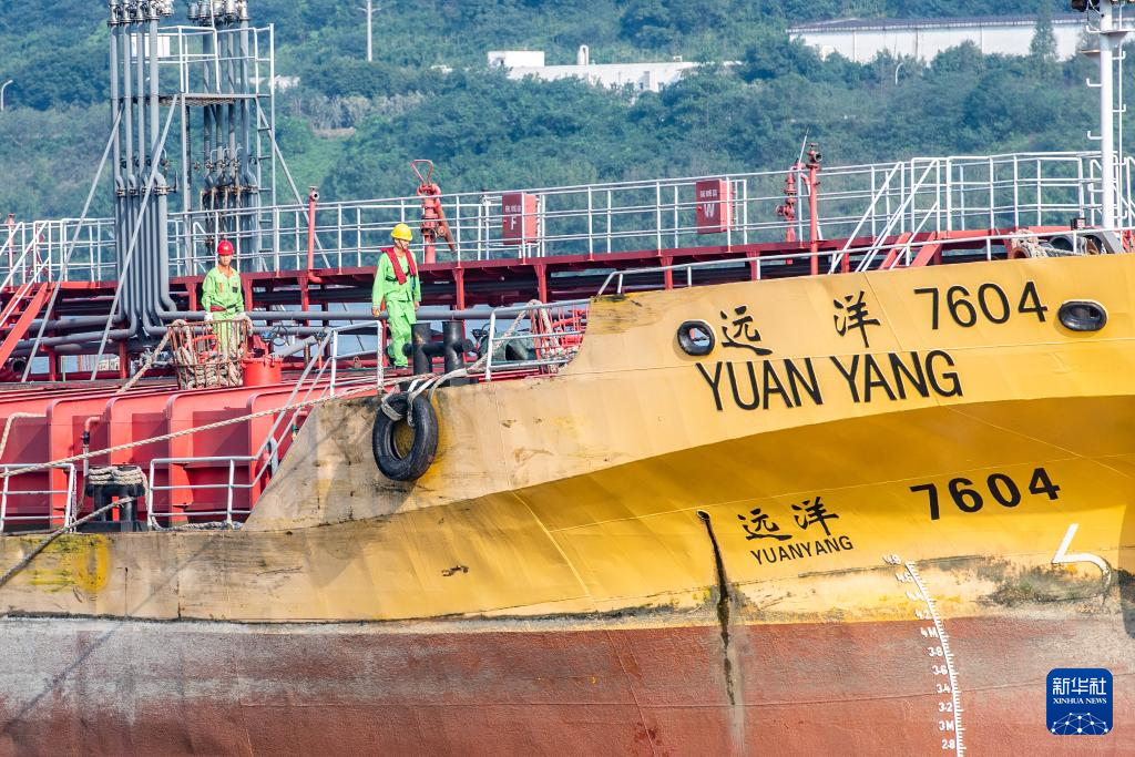 10月17日,在中国石化集团重庆川维化工有限公司物流码头,工作人员在检查出口产品装船情况。新华社记者 唐奕 摄