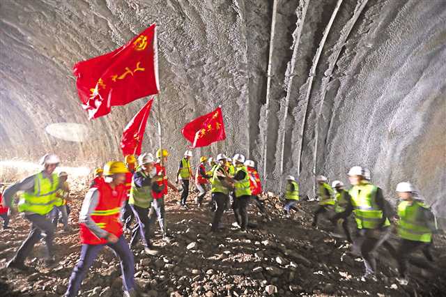 10月18日,渝湘高铁坝子隧道贯通,中铁十一局的建设者在贯通点摇旗相拥。记者 罗斌 摄/视觉重庆