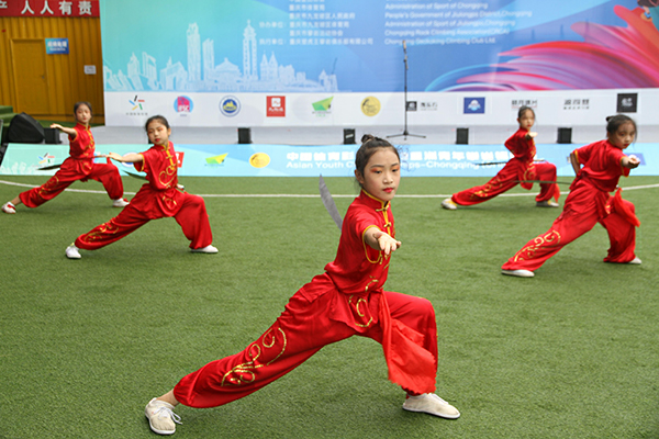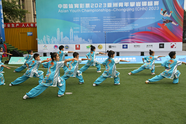10月19日,“中国体育彩票”2023亚洲青年攀岩锦标赛在重庆市九龙坡区举行,开幕仪式上九龙坡区人和小学带来了武术表演,旨在传承中华文化,让更多的人了解中国武术。