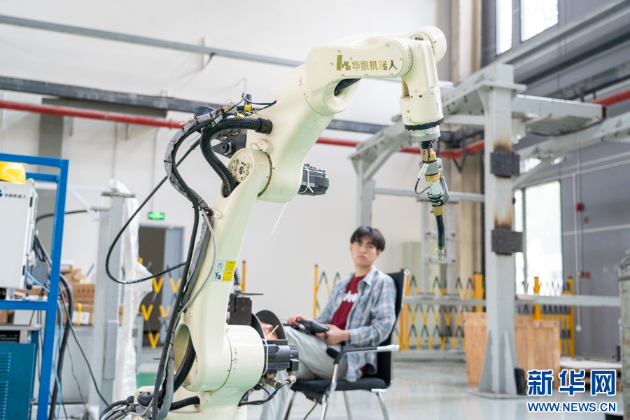 重庆智能机器人研究院的工业机器人测试车间内,工作人员正在对工业机器人进行性能测试。新华网 耿骏宇 摄