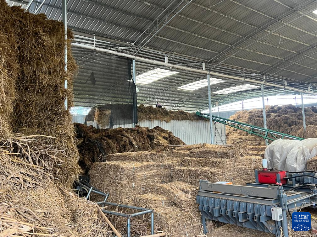 11月3日,在重庆市垫江县周嘉镇的一处秸秆收储点,秸秆被加工成草支垫等草制品。新华社记者赵佳乐 摄