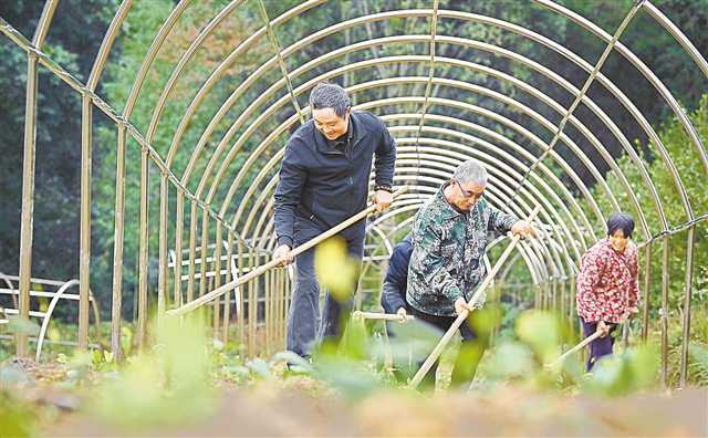 11月18日,张思砺(左)、文刚(中)和村民在基地里除草。