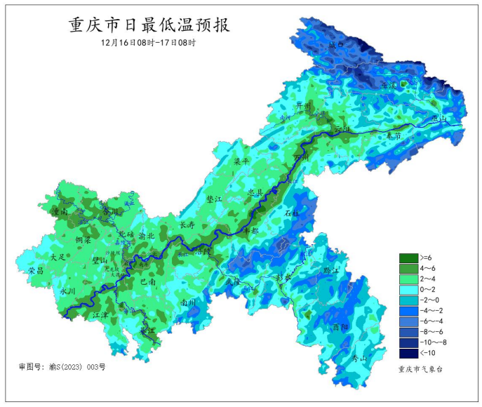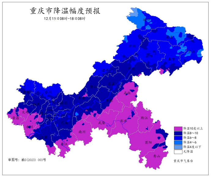 受南支槽和强冷空气共同影响,预计15―17日重庆市有强降温及雨雪天气过程,中东部海拔600米以上地区有雨夹雪或小雪到中雪,局地大雪到暴雪。日平均气温大部地区下降7-10℃,部分地区下降10-12℃;16―17日大部地区最低气温将降至0-5℃,海拔600-1500米地区将降至-6-0℃,海拔1500米以上地区将降至-13~-6℃。冷空气影响时山口河谷地区有6-7级阵风。