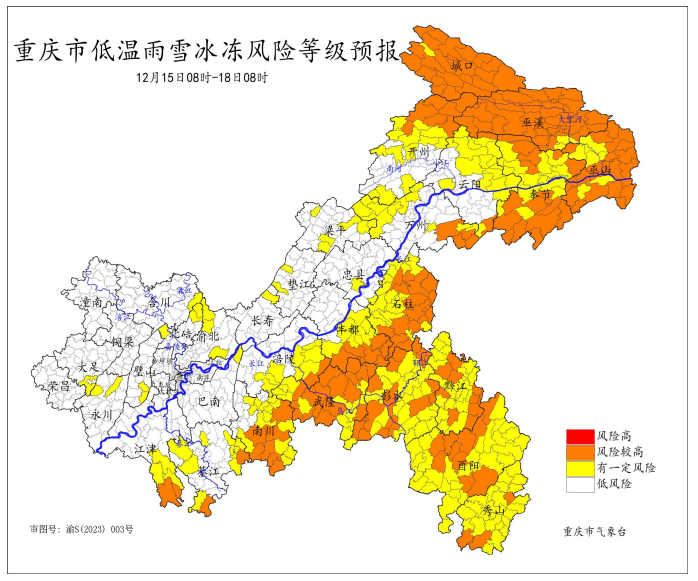 重庆市气象台提醒,15―17日中东部高海拔地区低温雨雪冰冻风险较高,需关注雨雪天气对交通出行、城市运行、电力和通信设施、农业生产、群众生产生活的不利影响。此次过程降温剧烈,公众需关注气温变化,做好防寒保暖措施。要加强安全取暖科普宣传,防范火灾和一氧化碳中毒。18―20日,大部地区日最低气温-3-4℃,仍较低,需关注持续低温天气的不利影响。