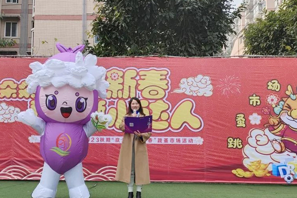 校长刘燕宣布渝北区花园小学2023年“庆元旦·迎新春”跳蚤市场正式开始。