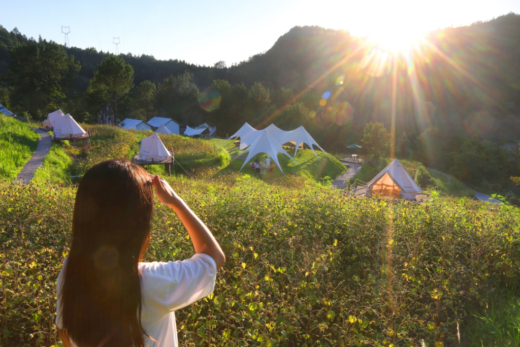 在石柱桥头镇的野奢露营地,游客正以白色帐篷为背景拍照。特约摄影 钟志兵视觉重庆