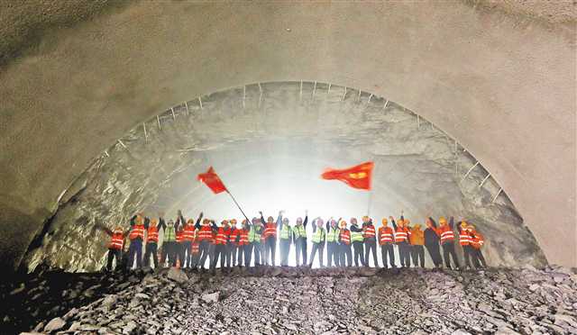 图为12月7日,渝湘高铁重庆至黔江段首座万米长隧——桂花园隧道顺利贯通,较计划提前1个月,中铁十一局的建设者在贯通点摇旗庆贺。(记者 罗斌 摄/视觉重庆)