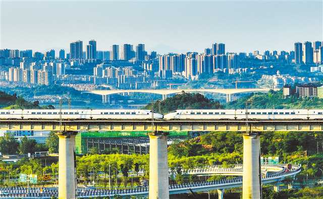 图为6月25日,一列成渝高铁列车飞速驶过重庆中心城区。(记者 龙帆 万难 齐岚森 摄/视觉重庆)