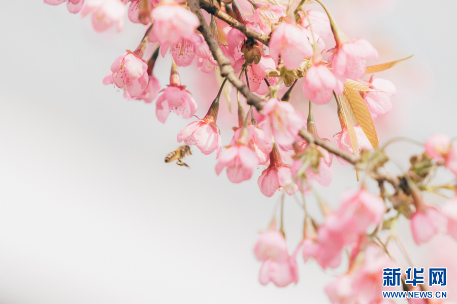 盛开的冬樱花吸引小蜜蜂前来采蜜。新华网 耿骏宇 摄