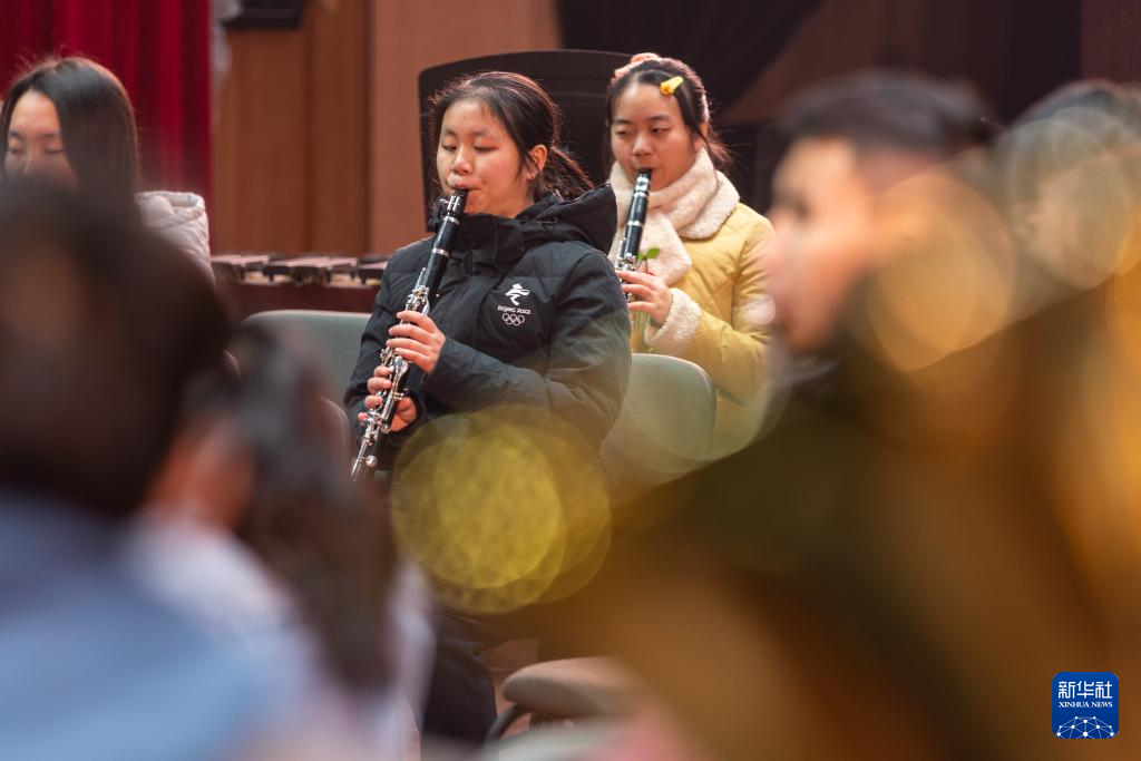 2023年12月28日,在重庆市特殊教育中心的扬帆音乐厅,扬帆管乐团成员在排练新年音乐会节目。新华社记者 储加音 摄