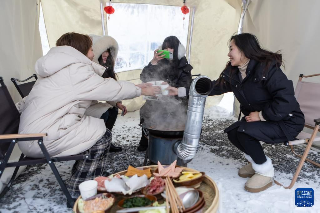 1月25日,在重庆市丰都县的南天湖国家级旅游度假区,游客在湖畔营地体验“雪地火锅”。新华社记者 储加音 摄