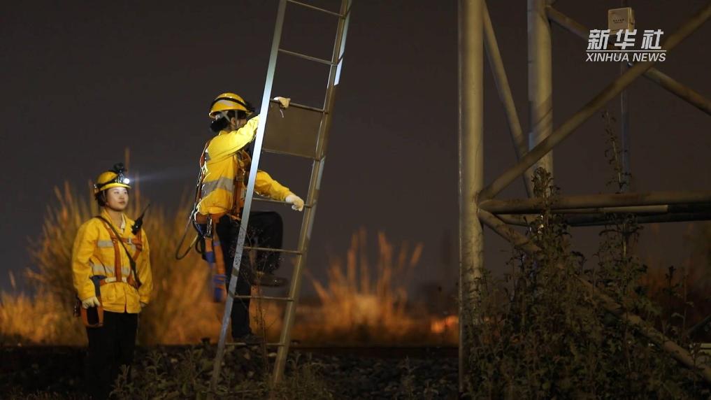 春运以来,每当夜幕降临,兴隆场编组站内总能看到这样一群年轻女孩,她们戴着晃动的头灯,背负数公斤重的工具材料,穿梭于22米高的电塔和17米高的灯桥进行检修作业。