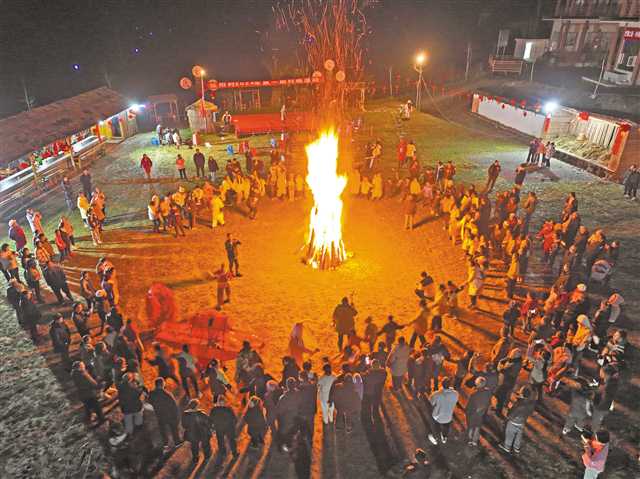 1月26日傍晚,彭水县太原镇区阳村,村民们围着篝火,跳起欢快的舞蹈,沉浸在欢乐的海洋中。当晚,该村2024年第一期“村晚”开场。特约摄影 赵勇/视觉重庆