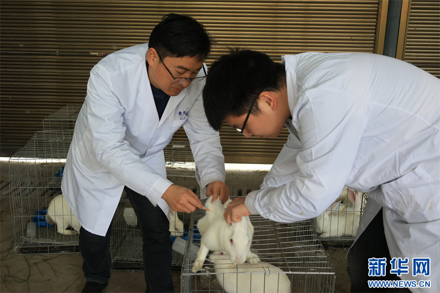 王庆华(左一)与冯浩为荣昌肉兔注射药剂。新华网 王位 摄