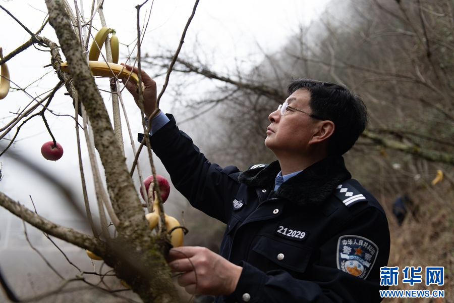 新华网重庆2月8日电(陈雨)“猴子们爱吃香蕉、苹果,马上要过年了,多放点儿,让它们也过个好年。”在重庆城口县河鱼乡畜牧村的大巴山深处,民警余新洪一边和同事念叨,一边在树上挂香蕉。