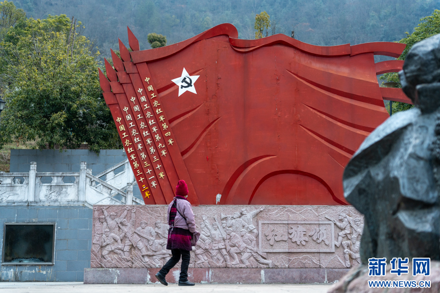 群众在城口县城红军公园“红旗颂”雕塑前驻足。新华网 耿骏宇 摄