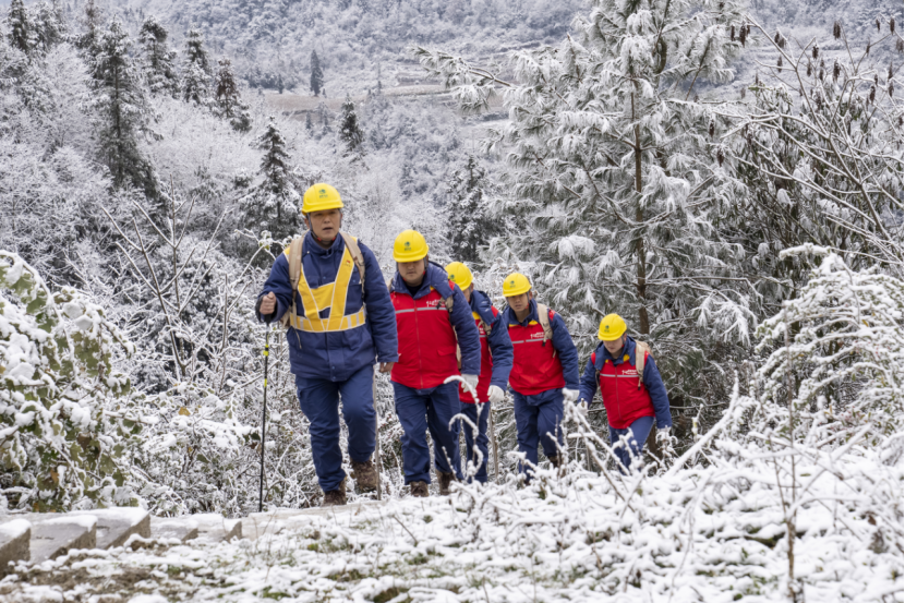 2月9日,除夕一大早,在彭水县中岭山,国网重庆电力员工对电力线路开展冰雪特巡,确保电网安全稳定运行。(牟伟 摄)