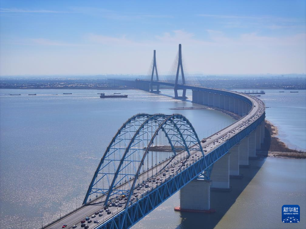 2月16日在江苏南通拍摄的沪苏通长江公铁大桥(无人机照片)。新华社发(许丛军摄)