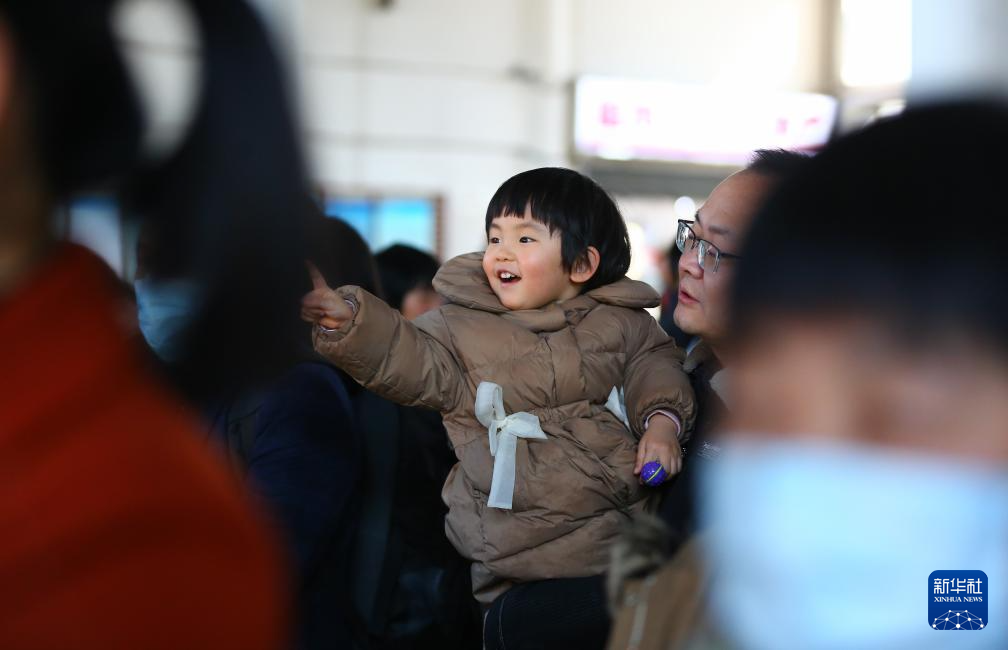 2月16日,一名小朋友在山东滕州站候车。新华社发(李志军摄)