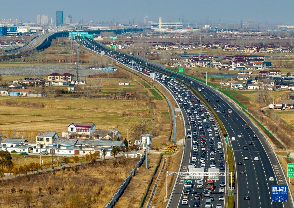 2月16日,车辆行驶在京沪高速江苏省淮安市淮安区境内(无人机照片)。新华社发(贺敬华摄)