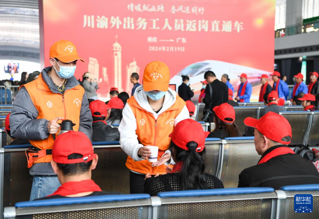 2月19日,重庆西站志愿者为乘坐返岗务工专列的旅客送上热水。新华社记者 王全超 摄
