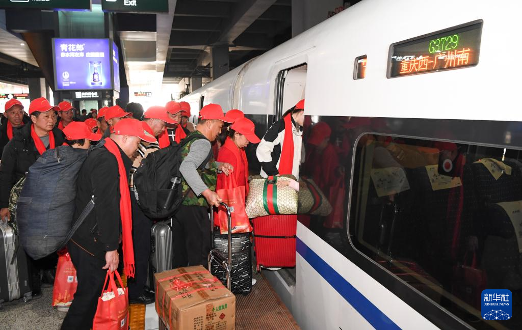 当日,来自川渝两地的300多名务工人员乘坐由重庆西开往广州南的G3729次列车,踏上返岗之路。这是春节后从重庆开行的首趟返岗务工专列,助力务工人员顺利返岗和企业复工复产。