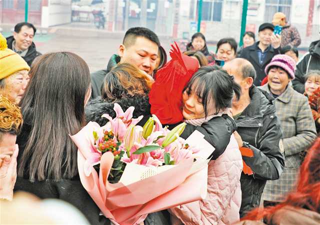 2月24日上午,明月社区格外热闹,挤满了迎接刘萍回家的乡亲们。刘萍缓缓走来,伴随着那声迟到了36年的“爸!妈!”邓心良夫妇走上前,一把抱住刘萍放声痛哭。家门口,妹妹、弟弟也与刘萍紧紧抱在一起,亲人相顾时,彼此都流下了激动的泪水。