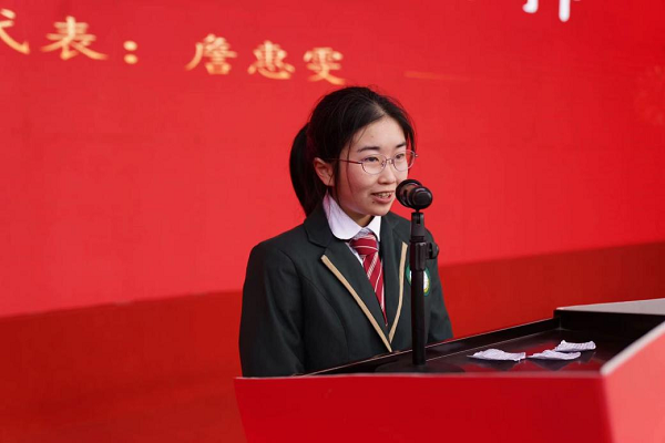 作为学生成长路上的引路人,教师代表王欣悦以“忆往昔,峥嵘岁月稠”“世上无难事,只要肯登攀”“数风流人物,还看今朝”三句诗词为同学们送上祝福。学生代表詹惠雯也在发言中讲述初中三年成长感悟。