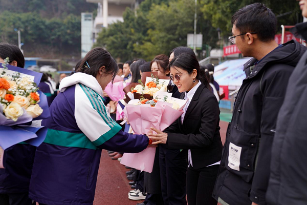 随后,家长将书信赠与孩子,并代表学校赠送大礼包。学生现场读信、拥抱父母,鼓励、期待与殷殷嘱托弥漫在字里行间,感恩、感谢、与感动蕴含在拥抱里。与此同时,学生也向陪伴他们度过美好初中三年的老师行拜师礼、赠送鲜花,以表达他们的感恩之心。