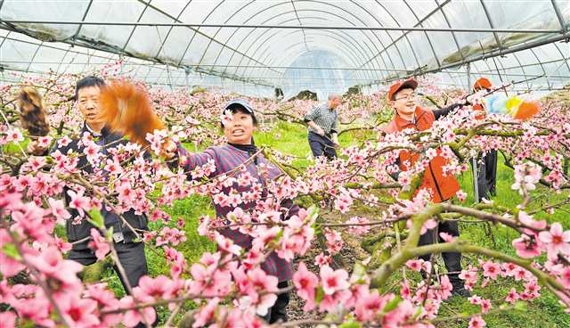 4月1日,武隆区火炉镇筏子村,果农在桃花盛开的脆桃林中疏花授粉。