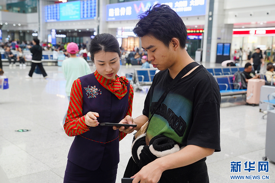 重庆北站工作人员帮助旅客查看乘车信息。新华网发(汪亮 摄)