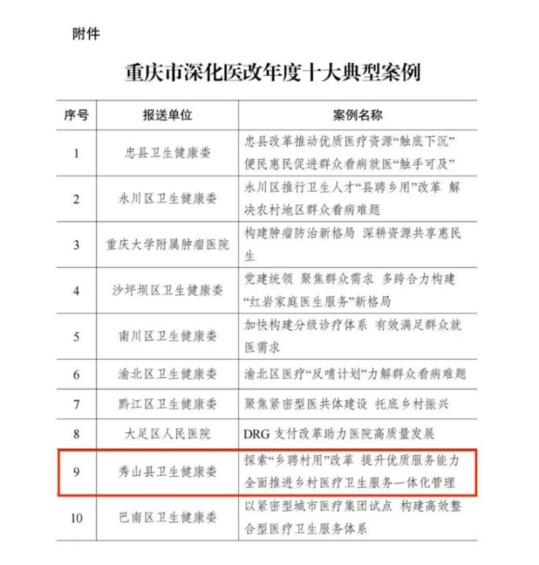 4月8日,重庆市卫生健康委印发《关于深化医改年度十大典型案例评选结果的通报》,对全市医改工作进行评选,秀山县“乡聘村用”改革获评“深化医改年度十大典型案例”,并在全市推广。