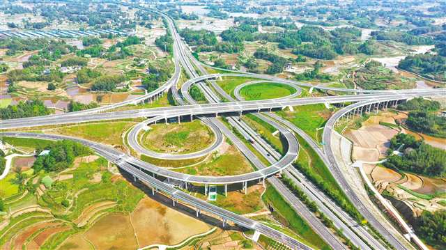 4月14日,梁平区礼让镇齐河村,梁开高速(重庆段)齐河互通枢纽立交桥道路纵横交错,美丽壮观。
