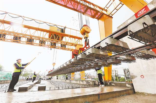 图为4月19日上午10时许,轨道交通6号线东延工程正线百乐园铺轨基地,首段轨道成功铺筑。记者 罗斌 摄/视觉重庆