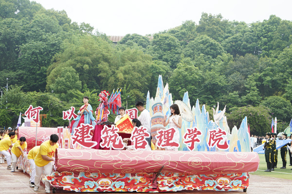 建筑管理学院以“何以中国”为主题设计花车,以山水卷轴为形,祥云相衬,配以敦煌飞天、川剧、旗袍油纸伞等,尽显东方美学。