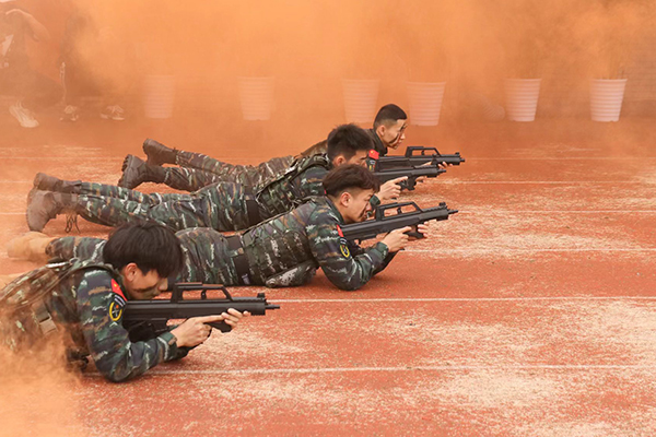 逐梦新时代,迷彩青春更精彩。同学们身着迷彩服,迈着坚定的步伐,喊着嘹亮的口号,带来了精彩的持枪战术表演。