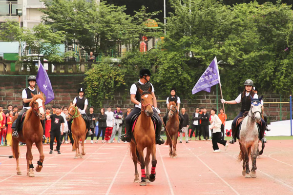 少年春风马蹄疾,不惧岁月不惧风。国际教育学院马术方阵的骑手们身着统一的骑装,英姿飒爽,精神抖擞,为大家呈现了一场精彩绝伦的马术表演。