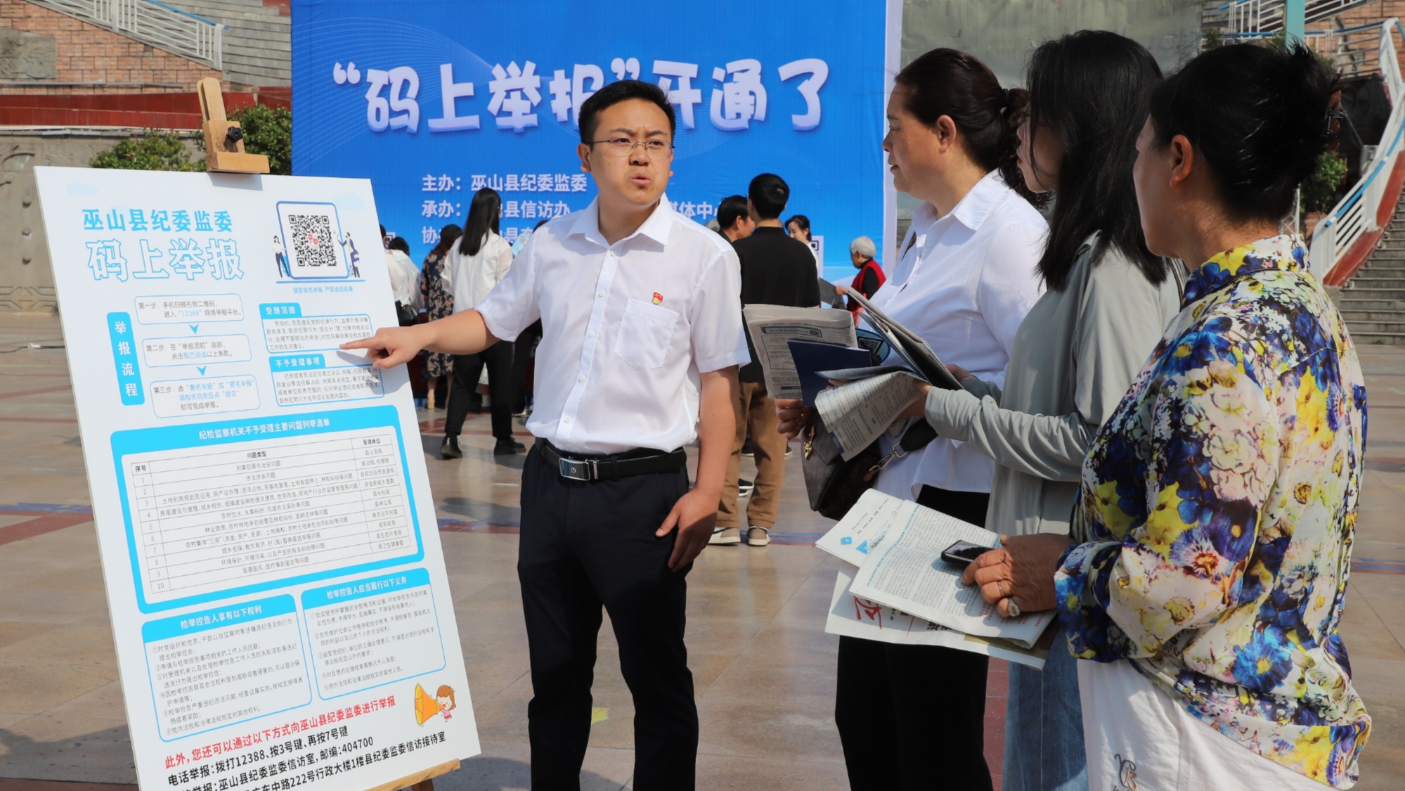 4月28日,重庆巫山县纪委监委在巫山县市政广场和各乡镇同时开展“码上举报”开通宣传活动。活动现场,通过设置展板,放置纪检监察工作亮点、信访举报方式、网上信访流程、信访事项办理时限等内容进行专题宣传。