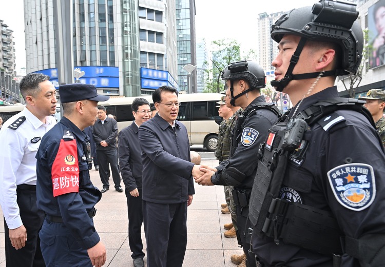 5月3日上午,在观音桥商圈,市委书记袁家军,市委副书记、市长胡衡华同正在执勤的武警、公安干警和综治人员握手交谈。记者 刘力 摄/视觉重庆