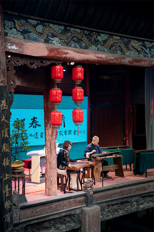 在安居古城湖广会馆古戏台上,一场以“古韵春意闹”为主题的交流演出精彩上演。渝中区非物质文化遗产天风古琴代表传承人叶雪萍抚琴独奏《神人畅》,曲调悠扬,意境深远。天风琴人邱冰则以清朝《自远堂琴谱》中的《归去来辞》为蓝本,为观众带来了一场深沉且情感丰富的古琴独奏,赢得了在场观众的阵阵掌声。