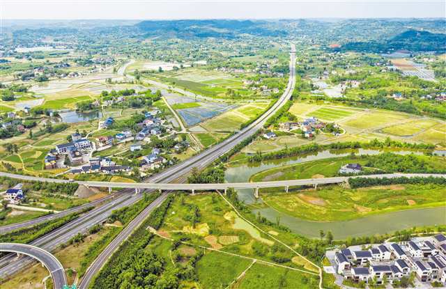 5月23日,大足区三驱镇,高速公路跨越山川田野,与村庄相互映衬,构成一幅美丽的画卷。