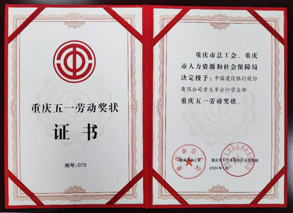 建行重庆市分行营业部获2024年“重庆市五一劳动奖状”。
