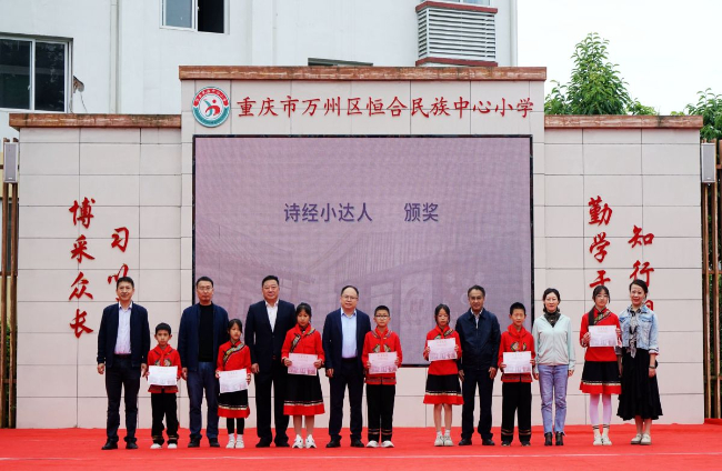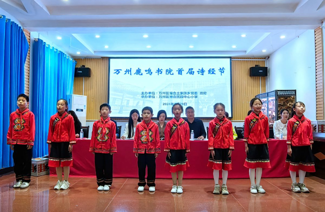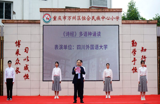在活动现场,万州区恒合民族中心小学的师生、家长代表们同台朗诵《阅读之光鹿鸣启航》,并举行《诗经》小达人、《诗经》导师、《诗经》达人代表颁奖。四川外国语大学党委常委、副校长严功军和该校大学生代表带来的《诗经》多语种诵读表演,让师生们感受到俄语、英语、法语、阿拉伯语、西班牙语演绎出的《诗经》文化魅力。