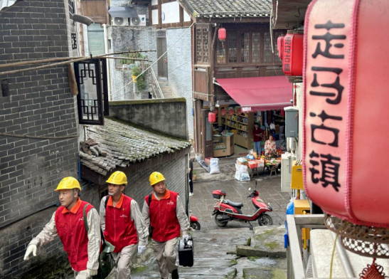 国家电网红岩(市区科学城)共产党员服务队队员走进走马镇集市,对集市沿街商铺的用电设备进行安全检查。