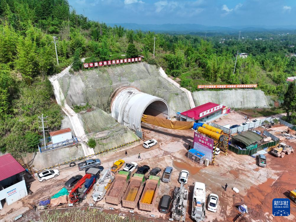 这是6月5日拍摄的成渝中线高铁黄连堡隧道建设现场(无人机照片)。新华社记者 唐奕 摄
