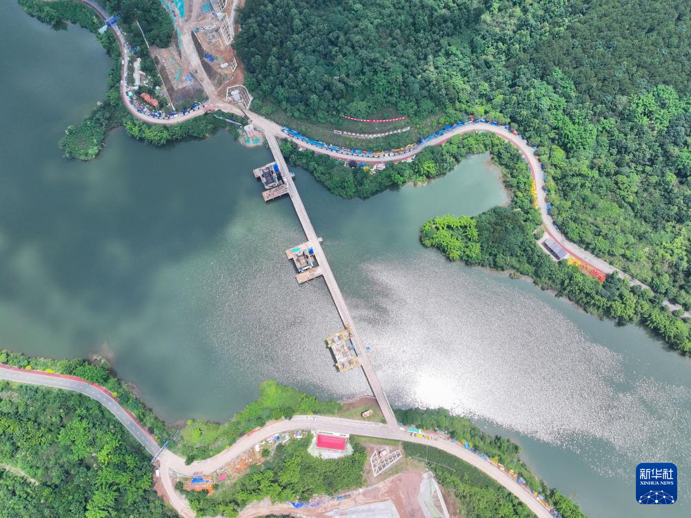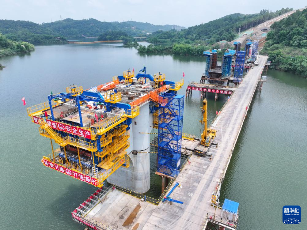 这是6月5日在重庆市铜梁区拍摄的成渝中线高铁玄天湖大桥建设现场(无人机照片)。