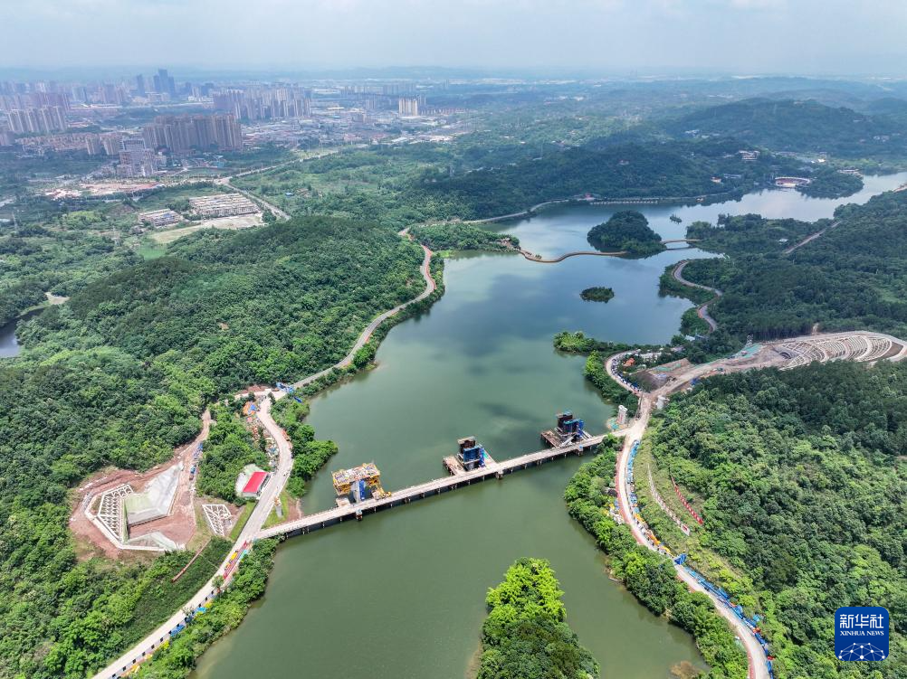 这是6月5日在重庆市铜梁区拍摄的成渝中线高铁玄天湖大桥建设现场(无人机照片)。新华社记者 唐奕 摄