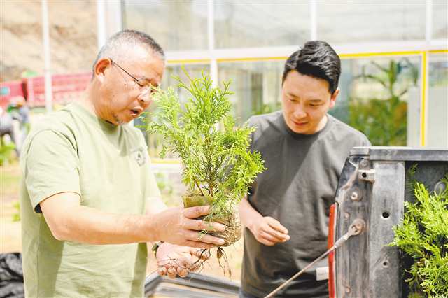 6月4日,怒江畔的左贡县苗木育苗基地,杨泉(左)正在介绍崖柏幼苗的特点。